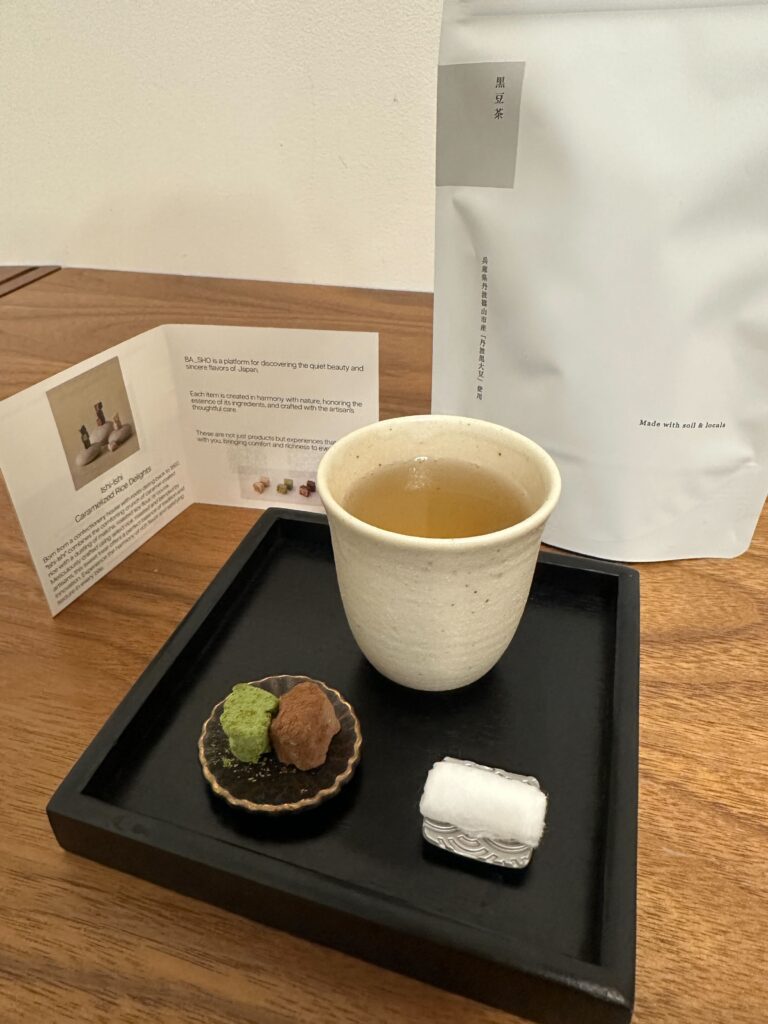 At our salon, we serve our customers black soybean tea accompanied by a traditional rice confection known as "okoshi".